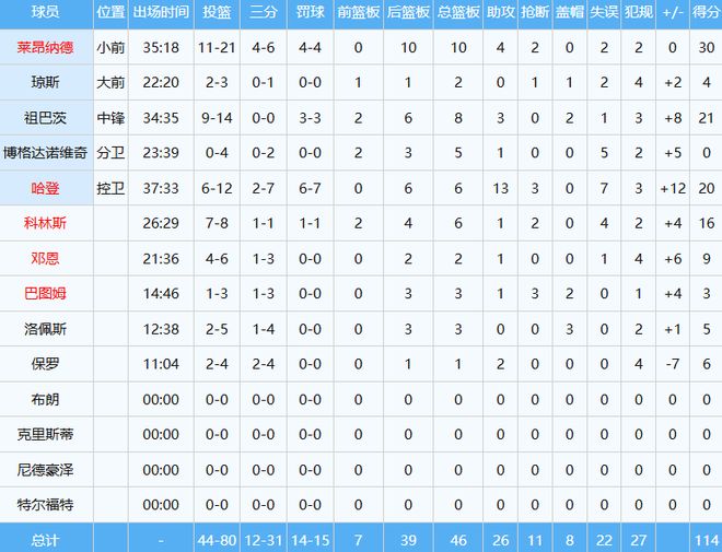 本場(chǎng)開拓者全隊(duì)數(shù)據(jù)如下: