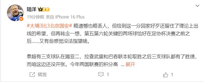 而在北京國安慘遭絕平后,在前三輪僅僅拿到2分,繼續(xù)排名小組倒數(shù)第一的同時(shí),出線形勢岌岌可危,對此,也是引來不少媒體人熱議,其中,記者陸洋發(fā)文表示,北京國安略遺憾也略丟人,但撿到這一分回家好歹還留住了理論上出線的希望……