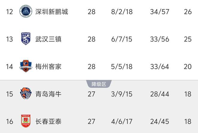 中超最新積分榜:保級形勢巨變,新鵬城基本上岸,倒數(shù)3隊仍差2分