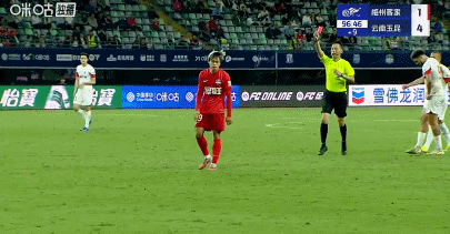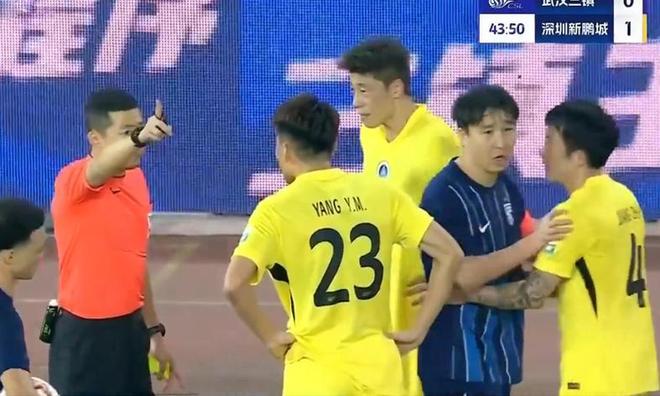 第43分鐘,楊一鳴肘擊沈子貴,張雷出示紅牌將其罰下,新鵬城10人應戰(zhàn)。深圳新鵬城眾將投訴無果,這一判罰引發(fā)球迷不滿。