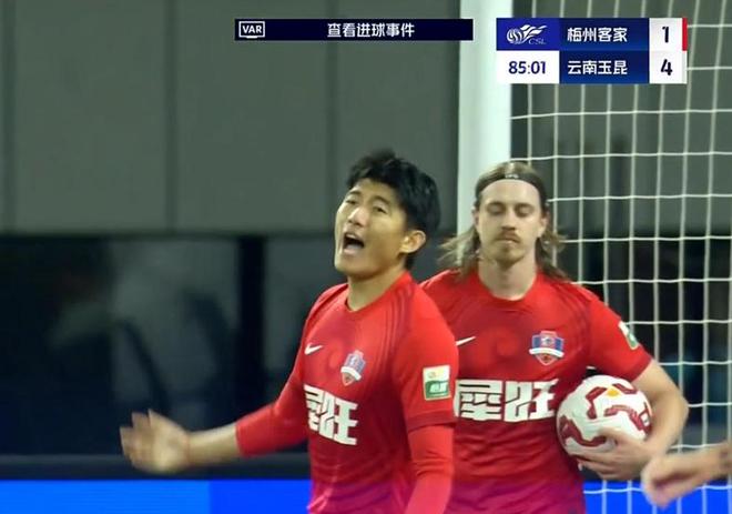 第85分鐘,楊瑞琪破門,扳回一城,VAR介入,進球有效,梅州客家1-4落后。