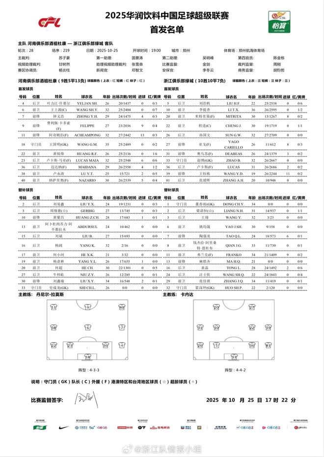 北京時間10月25日19:00,中超第28輪繼續(xù)進行,河南坐鎮(zhèn)鄭州航海體育場迎戰(zhàn)浙江,本場主裁判為蘇子豪,VAR裁判為甘樹然,賽前雙方首發(fā)出爐。