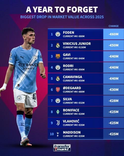 25年德轉(zhuǎn)身價(jià)跌幅前10:福登跌6000萬最高,維尼修斯跌5000萬