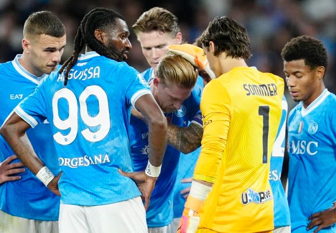 第33分鐘,迪洛倫佐被放倒,裁判判罰點(diǎn)球。德布勞內(nèi)主罰,他穩(wěn)穩(wěn)把球罰進(jìn),幫助那不勒斯取得領(lǐng)先。而德布勞內(nèi)因此拉傷了,不得不被換下場,有些倒霉。第40分鐘,巴斯托尼差一點(diǎn)進(jìn)球,他的頭球攻門擊中了橫梁彈出。半場補(bǔ)時階段,鄧弗里斯頭球攻門,皮球擊中立柱彈出底線。半場結(jié)束,那不勒斯1-0領(lǐng)先國際米蘭。