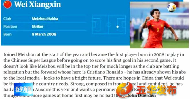 《衛(wèi)報(bào)》在對(duì)魏祥鑫的評(píng)語中,給出了高度評(píng)價(jià)與中肯建議:“今年年初加盟梅州客家,成為第一位在中超踢球的2008年出生的球員,他在第二場(chǎng)比賽中打進(jìn)了職業(yè)生涯的第一個(gè)進(jìn)球,看起來他有著光明的未來。這位前鋒的偶像是C羅,他已經(jīng)向中國(guó)的媒體展示了他的腹肌。在中國(guó),球迷希望魏祥鑫能成為國(guó)家隊(duì)需要的前鋒。他強(qiáng)壯、沉著、自信,今年在歐塞爾試訓(xùn)過,希望不久之后能在歐洲永久效力,不過先在國(guó)內(nèi)多踢一些比賽也不是壞事?!?/p>