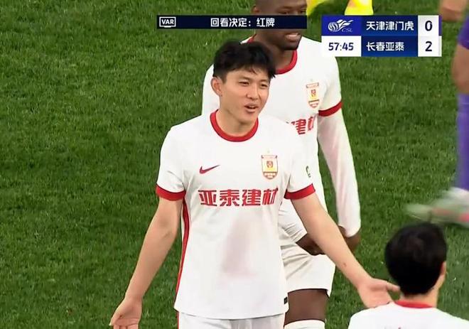 第58分鐘,王禹踢中了哈達(dá)斯腳踝,VAR介入,裁判回看之后取消黃牌,改判紅牌。亞泰少打一人!