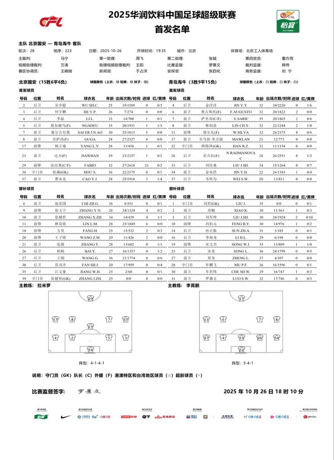 北京時(shí)間10月26日晚間19:35,中超聯(lián)賽第28輪,北京國安坐鎮(zhèn)主場北京工人體育場,迎戰(zhàn)青島海牛,本場比賽主裁判為馬寧,視頻助理裁判為萬濤,雙方首發(fā)名單: